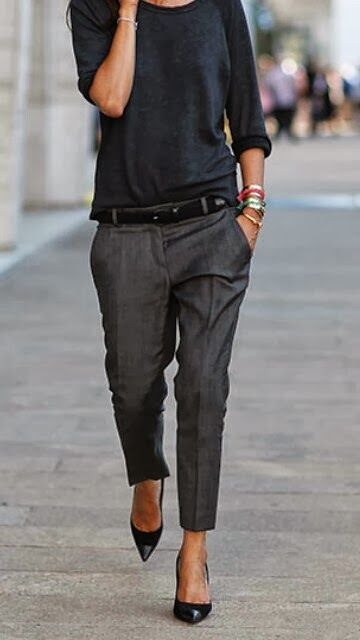 TAILORED PANTS: Flat front, ankle-crop pants are the most flattering and versatile. Detail such as a tuxedo stripe give your work pants a fresh update. If you’re daring, try a maroon or forest green color.